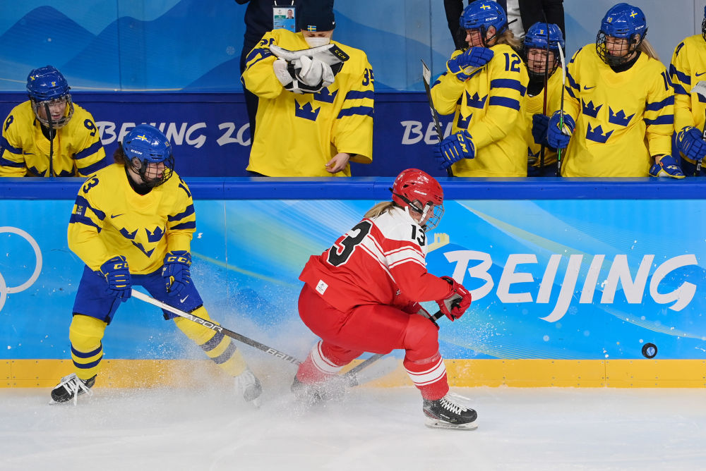 2022年2月8日,丹麦队球员米歇尔·布里克斯 (右下) 和瑞典队球员埃玛 ·穆伦 (左下) 在比赛中拼抢。