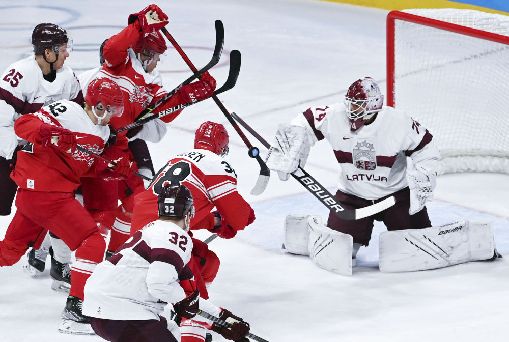 2022年2月15日,拉脱维亚队守门员伊瓦尔斯·蓬涅诺夫斯(右一)在比赛中面对丹麦队球员进攻。