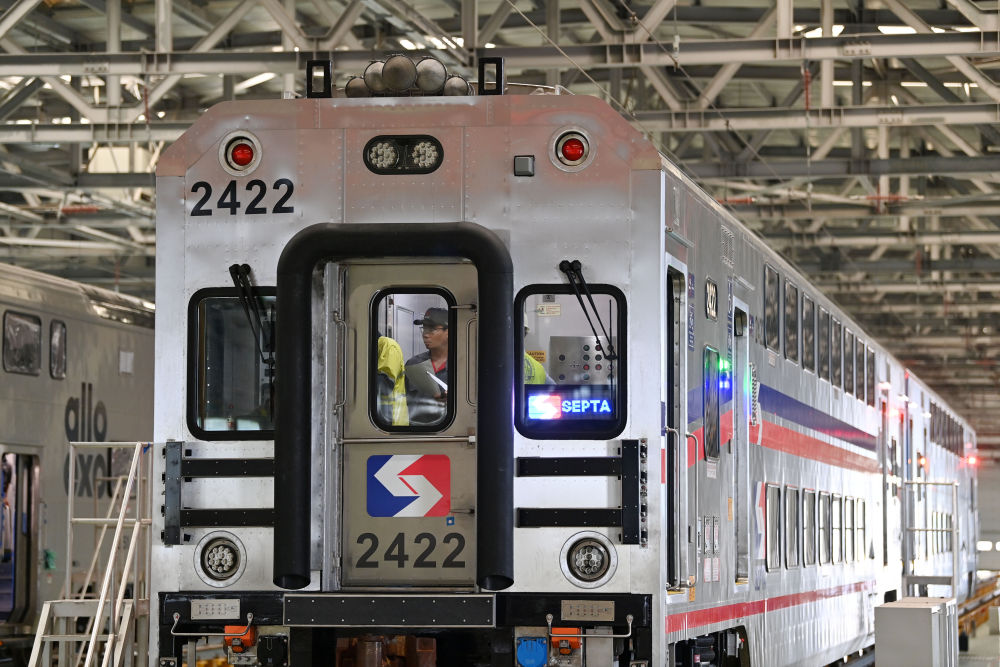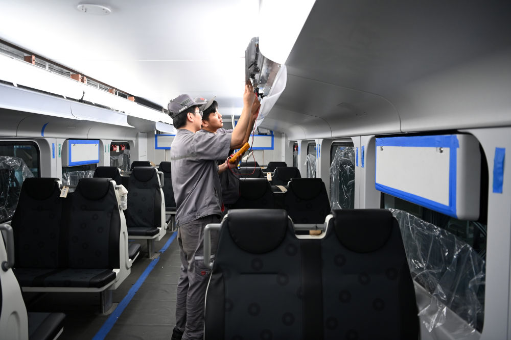 2022年7月14日,在天津中车唐车轨道车辆有限公司,工作人员在车厢内进行检测。