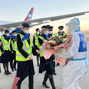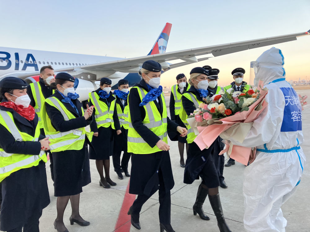 2022年12月10日,天津滨海国际机场工作人员给JU702航班机组人员献花。