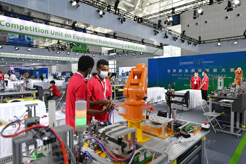 2022年8月19日,在国家会展中心(天津),首届世界职业院校技能大赛的参赛选手在操作机械设备。