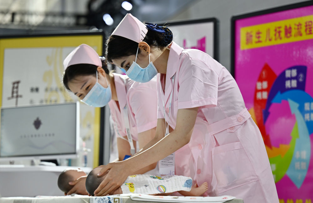 2022年8月19日,在国家会展中心(天津),首届世界职业院校技能大赛的参赛选手在演示新生儿抚触。