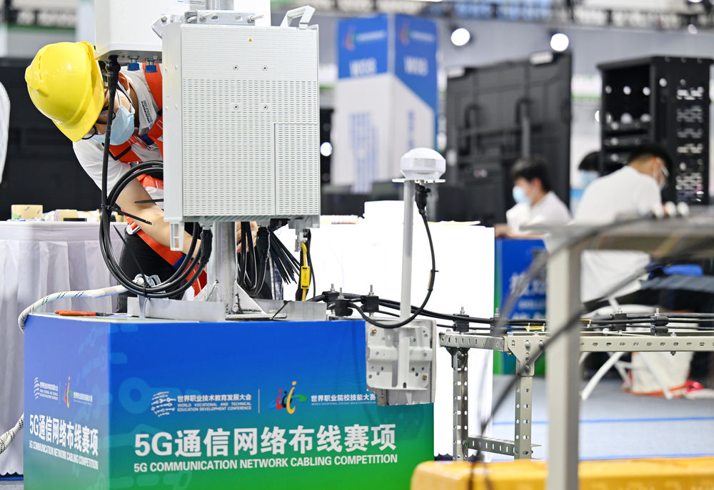 2022年8月19日,首届世界职业院校技能大赛的参赛选手在国家会展中心(天津)进行5G通信网络布线。