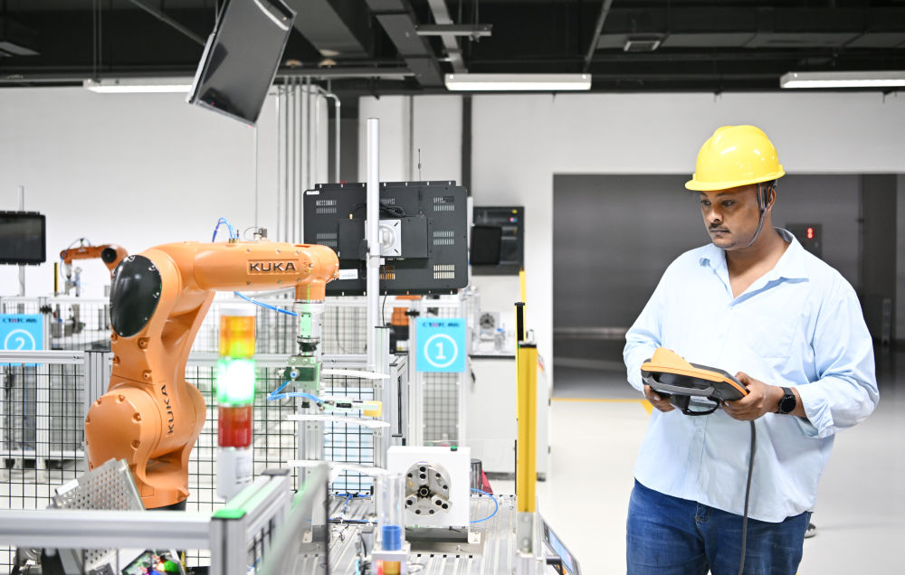 许超(中)在天津机电职业技术学院的教室内给学生讲解设备操作要领(2022年8月8日摄)。