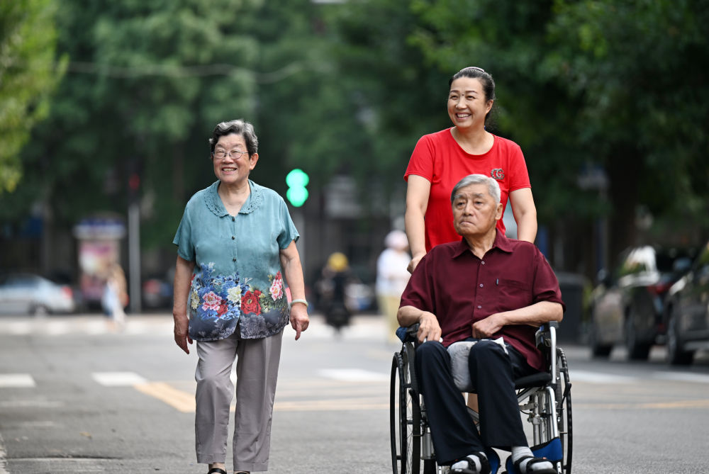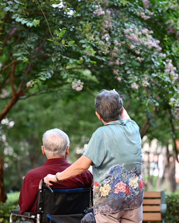 2022年7月30日,段肇谊(右)推着坐在轮椅上的顾伟力赏花(这张照片已入选“2022年新华社年度照片”)。