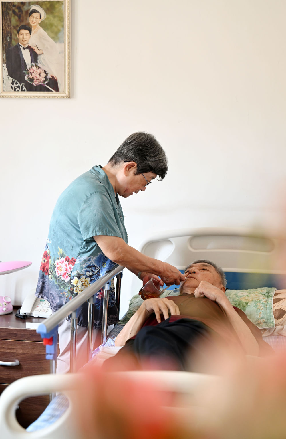 2022年7月22日,段肇谊(左)给躺在床上的顾伟力喂水。