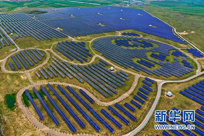 这是位于山西省大同市云州区杜庄乡土井村的以熊猫为造型的光伏电站(无人机照片,2021年8月3日摄)。新华社记者 曹阳 摄