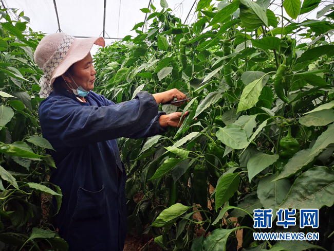山西省河曲县榆岭窊村大力发展设施蔬菜,并上了北京人的餐桌。这里的村民变成了新型职业农民。图为榆岭窊村民于明英在采摘辣椒。(2022年6月28日摄)新华社记者孙亮全 摄