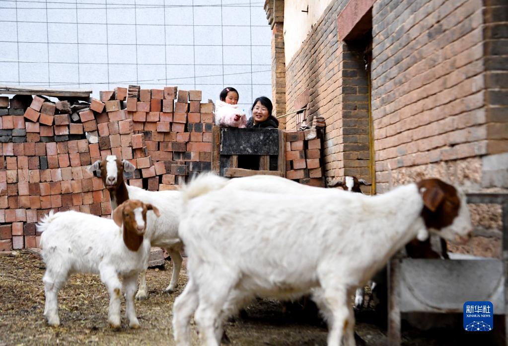 1月19日,吕海云抱着女儿靳佳颖数自家羊圈里的羊。