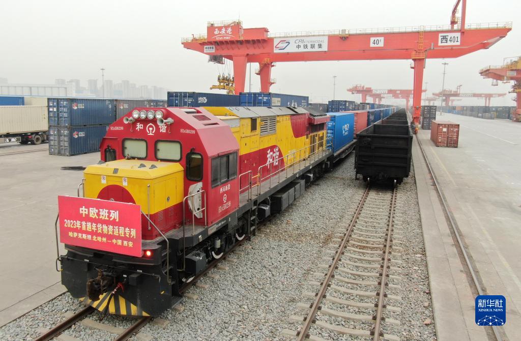 1月13日,满载着来自哈萨克斯坦1300吨面粉的中欧班列抵达西安国际港站,为春节拉来了“洋年货”(无人机照片)。新华社记者 李一博 摄