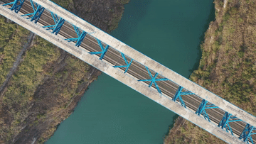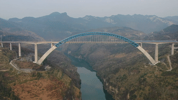 成贵高铁鸭池河双线特大桥,是全线跨度最大的桥梁。桥梁全长971米,最高处距离河面277米,是世界上最大跨径中承式钢混结合提篮拱桥。