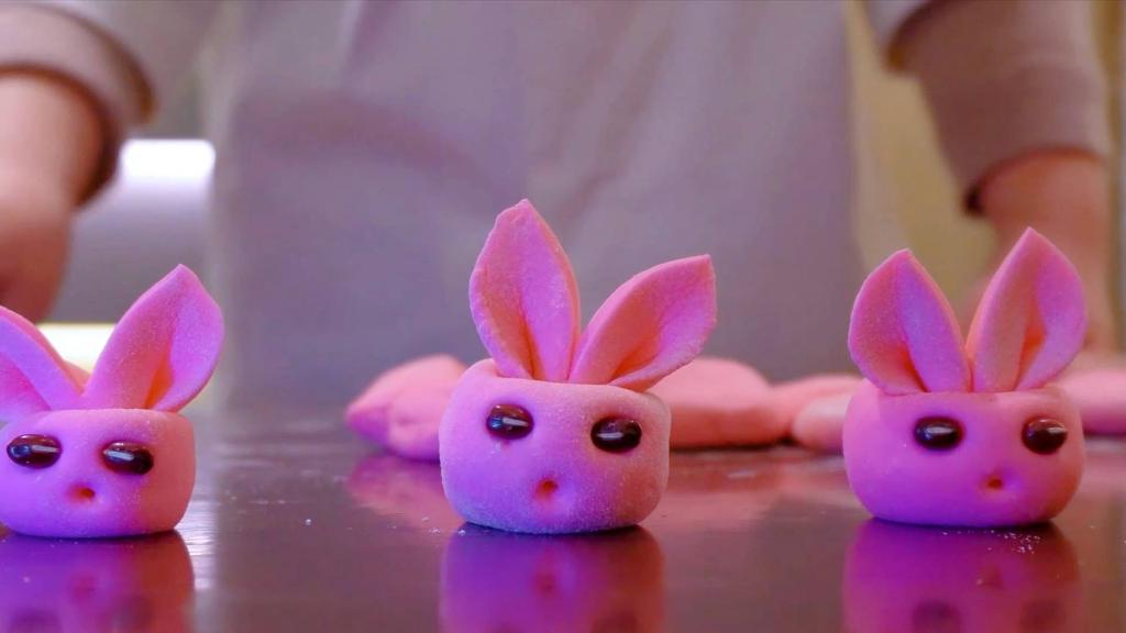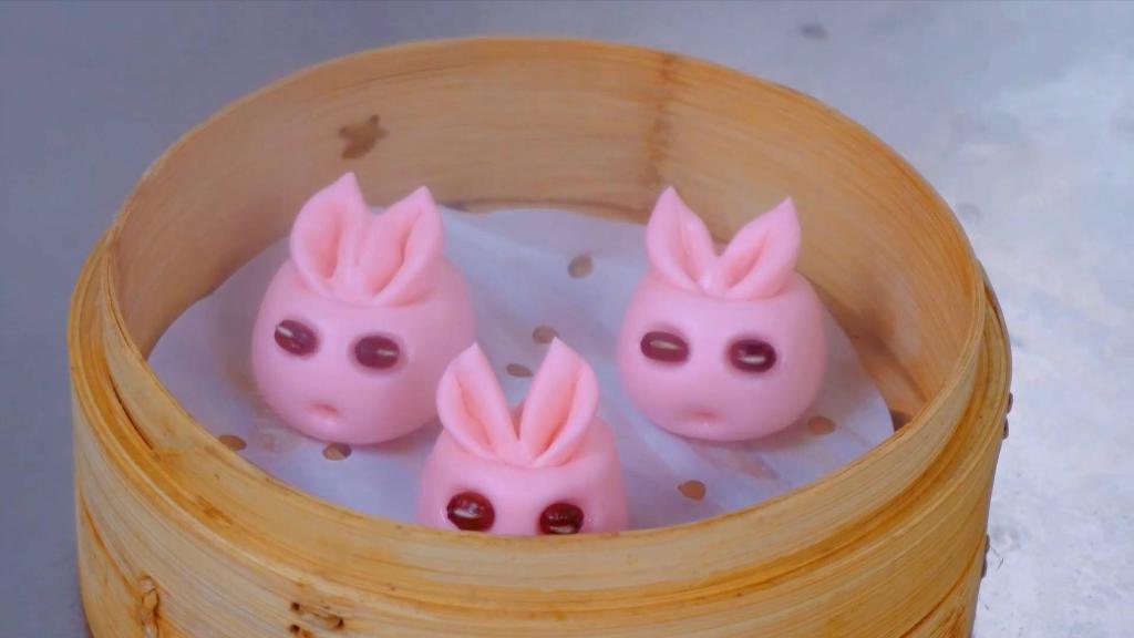 这款“兔子包”着色用的是天然的甜菜根汁,面团经过高温蒸制后呈现出淡淡的粉红色。兔子的红眼睛用的是小赤豆,每一颗都精心挑选,尽量大小一致、光滑椭圆。
