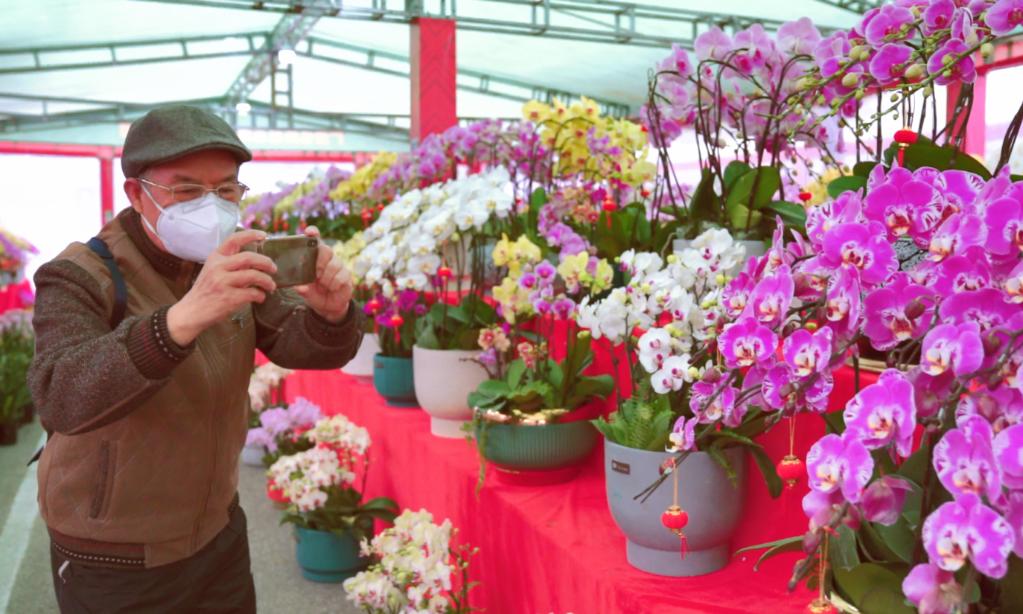 游客用手机拍摄花市里展销的蝴蝶兰。新华社记者 陈露缘 摄