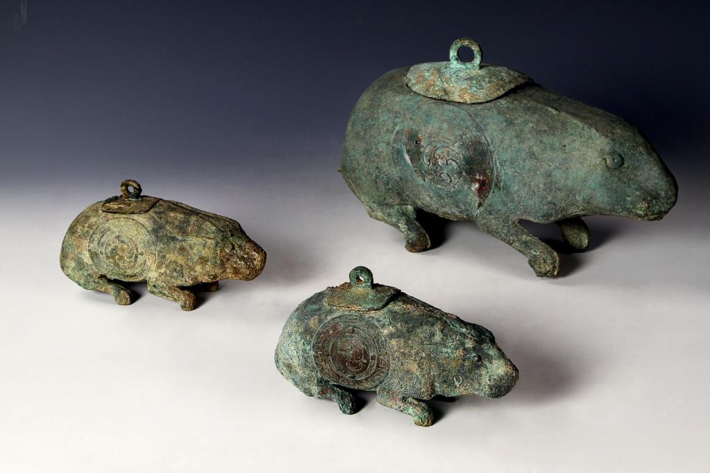这是晋穆侯墓出土的3件背上开长方形口,口上有盖的青铜兔尊。山西省晋国博物馆供图
