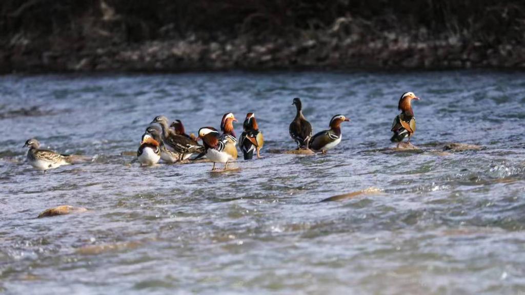 一群鸳鸯在甘肃省境内嘉陵江流域白水江段水面上嬉戏。(受访者供图)