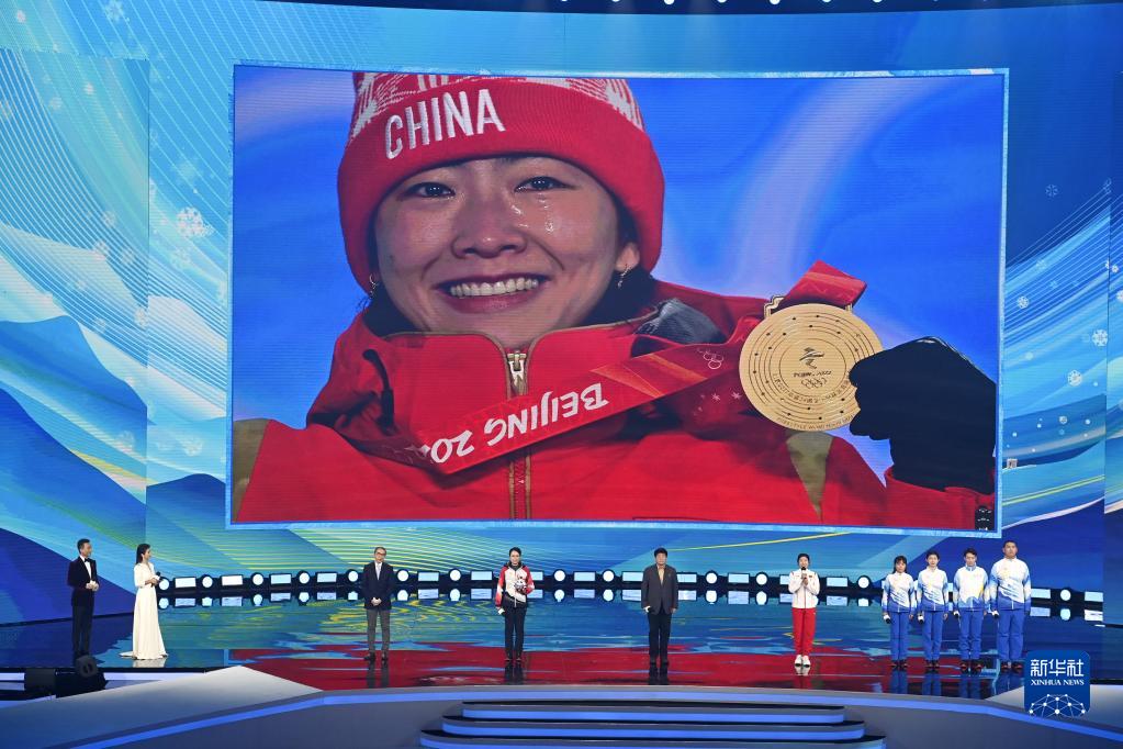2月4日,运动员徐梦桃(右五)在启动仪式上的冬奥人访谈环节发言。当日,以“非凡冬奥路 一起向未来”为主题的纪念北京2022年冬奥会成功举办一周年系列活动启动仪式在首钢冰球馆举行。新华社发