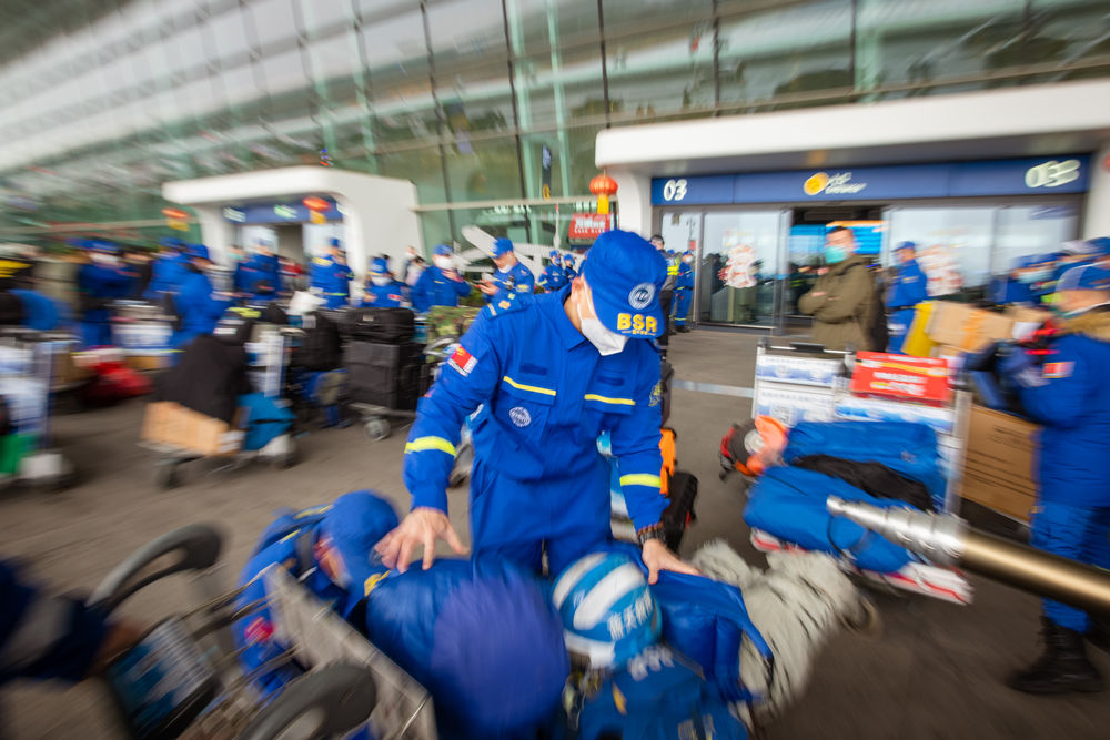 ↑2月8日,蓝天救援队队员在登机前集结开会。当晚,127名蓝天救援队队员携带救援物资乘坐中国南方航空CZ8021航班从武汉天河国际机场起飞,直飞土耳其伊斯坦布尔,驰援土耳其地震灾区。