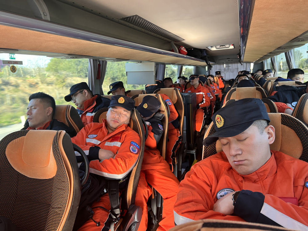↑2月8日,中国救援队集体搭乘长途大巴奔赴地震重灾区哈塔伊省参加救援行动(手机拍摄)。大巴上的时间是救援队员短暂的休息机会。