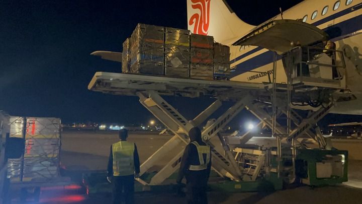 ↑2月8日,中国救援队抵达土耳其阿达纳机场卸运物资(手机拍摄)。