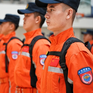 ↑2月7日,中国救援队队员在北京大兴消防训练基地准备出发。