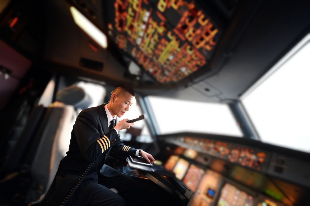 马保利在飞机驾驶舱内进行机长广播(驾驶舱进行了虚化处理)。