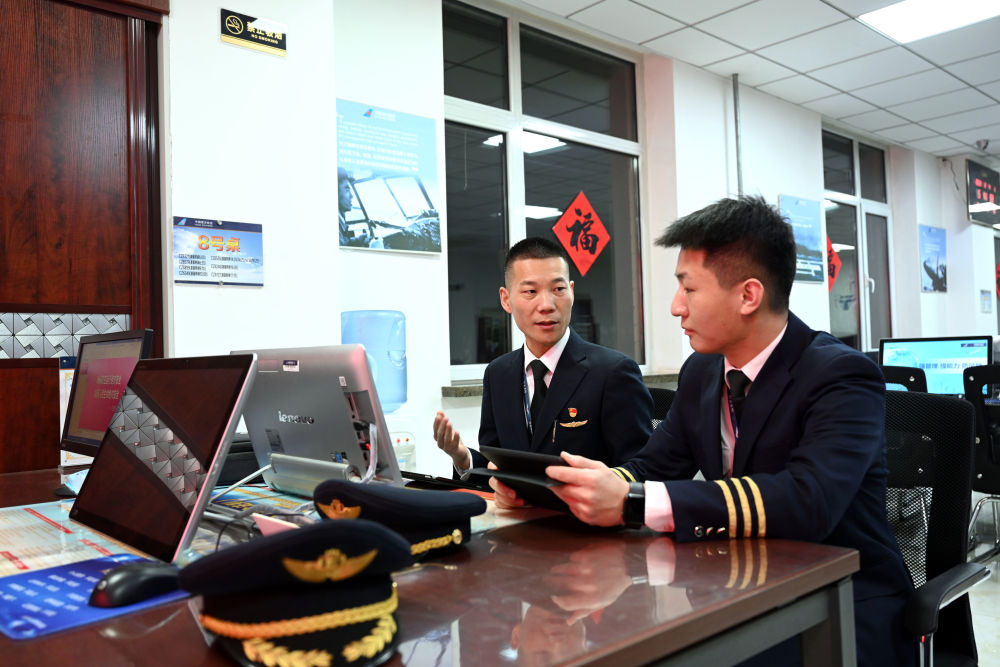 马保利在飞机起飞前与同事讨论工作安排。