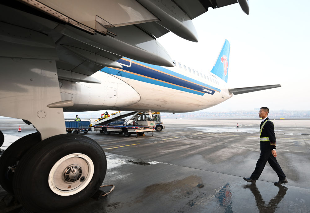 马保利在航班起飞前绕机巡检。