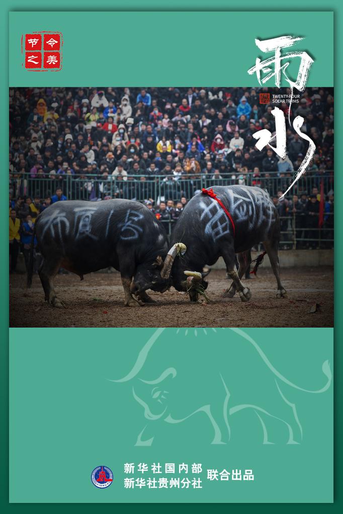 而在贵州省黔东南州从江县,苗族和侗族群众有着雨水节气斗牛的习俗。2月18日,雨水节气的前一天,从江县丙妹镇大塘村的斗牛场上,两只水牛展开了一场打斗,上万名苗侗群众来到现场,摇旗助威。