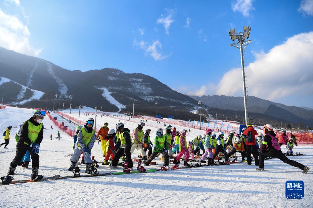2023年1月11日,滑雪冬令营学员在陕西太白鳌山滑雪度假区教练的带领下热身。新华社发(邹竞一摄)