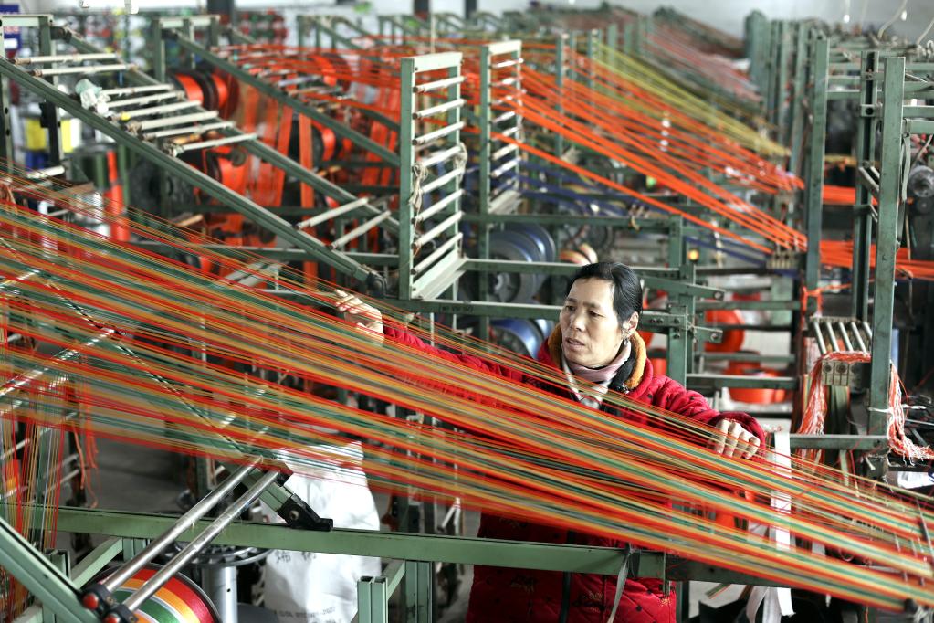 2月18日,山东省滨州市惠民县姜楼镇一家绳网企业工人在赶制一批来自国外的安全带订单。(新华社记者范长国 摄)
