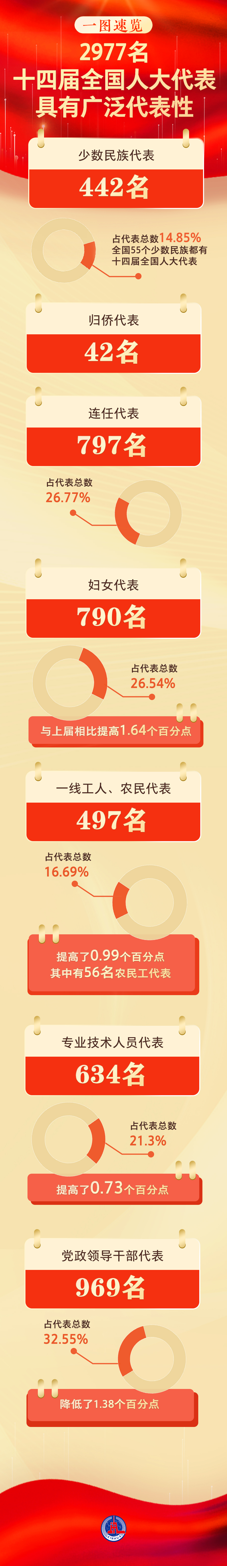 少数民族代表442名,占代表总数14.85%,全国55个少数民族都有十四届全国人大代表;