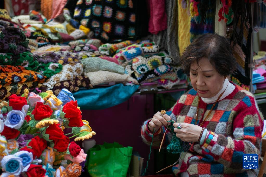 香港湾仔太原街露天市集毛衣毛线制品摊位老板杨丽萍在编织毛线(2月15日摄)。新华社记者 龙镜伊 摄