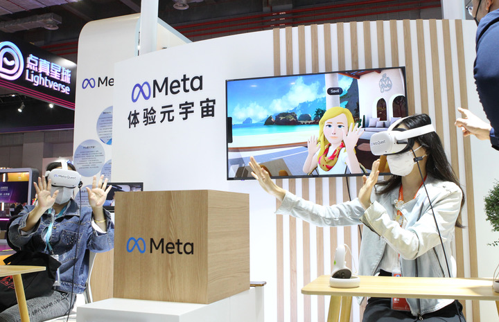 2022年11月7日,在第五届进博会技术装备展区的人工智能专区,体验者借助VR头戴设备感受在虚拟工作空间“隔空击掌”。 新华社记者 侯俊 摄