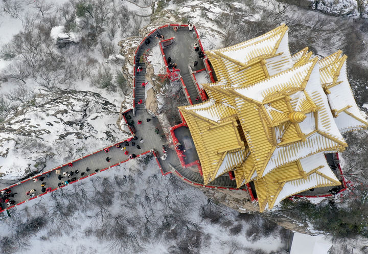游客在洛阳市栾川县老君山风景区游玩(2月23日摄,无人机照片)。新华社记者 李安 摄