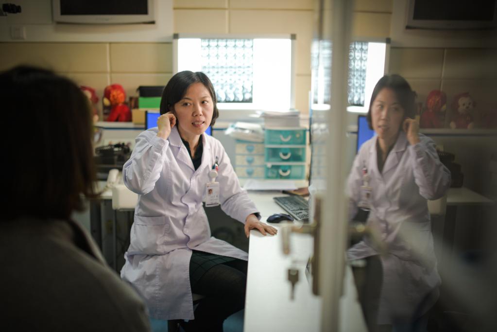 天津市第一中心医院耳鼻咽喉头颈外科主任王巍为患者讲解如何正确使用耳机。(天津市第一中心医院供图)