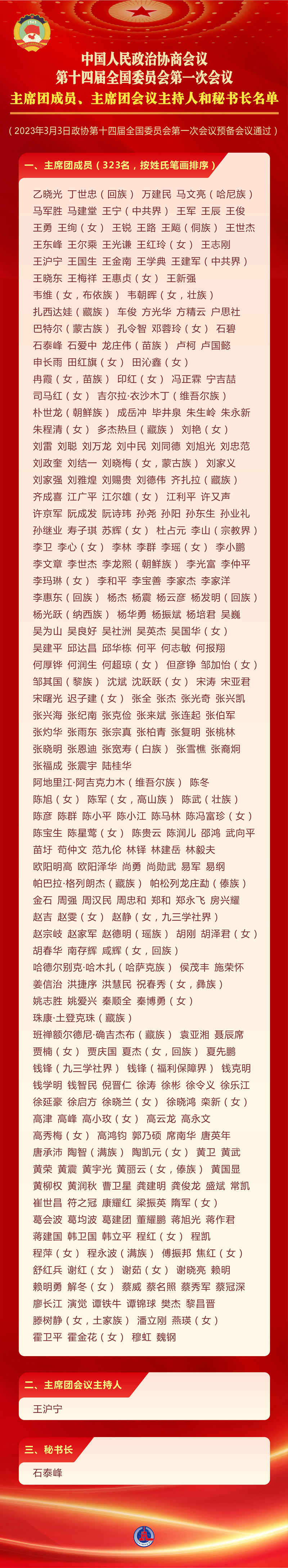 (两会受权发布)中国人民政治协商会议第十四届全国委员会第一次会议主席团成员、主席团会议主持人和秘书长名单-新华网