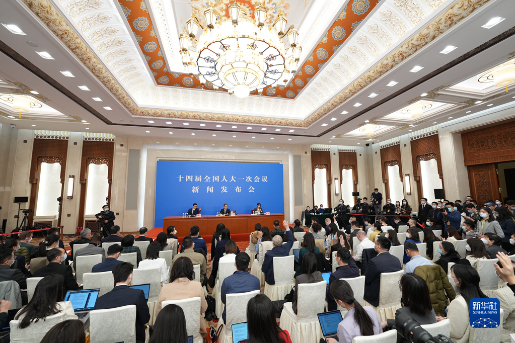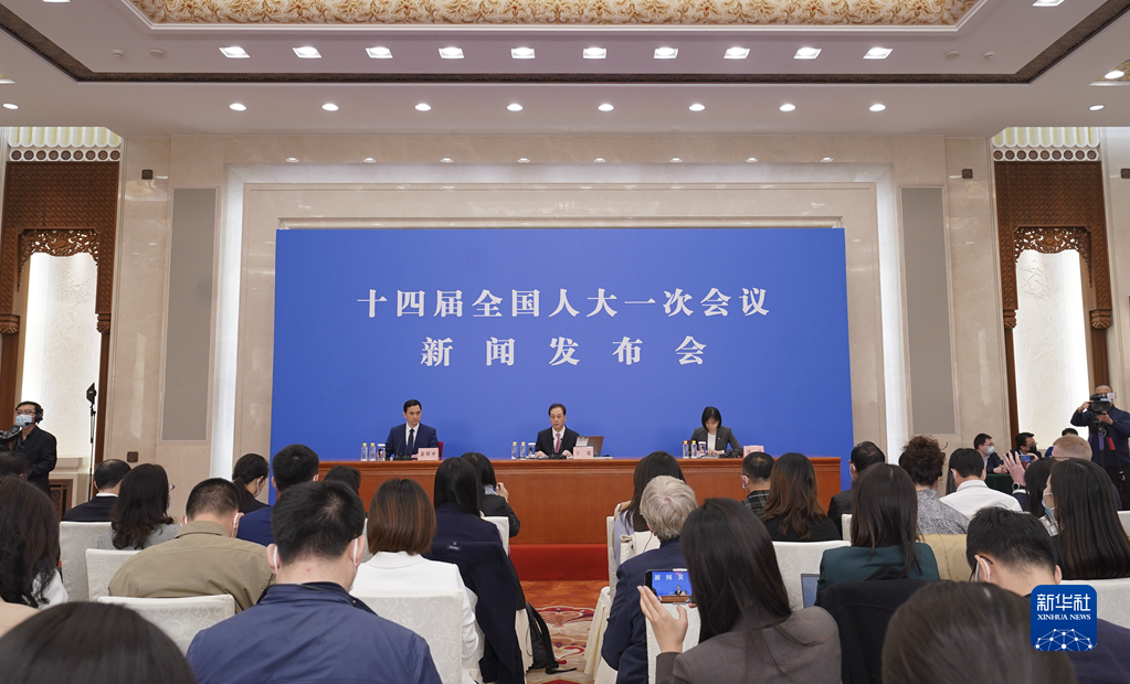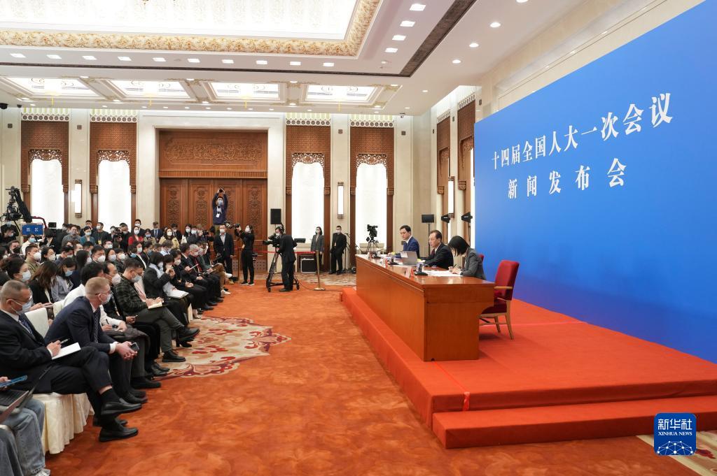 3月4日,十四届全国人大一次会议在北京人民大会堂举行新闻发布会。大会发言人王超就会议议程和人大有关工作回答中外记者提问。新华社记者 邢广利 摄