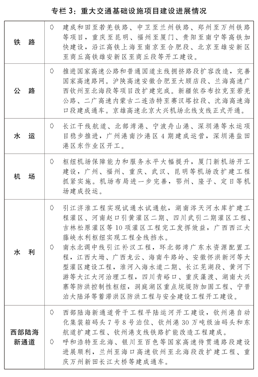 三是持续推进重大基础设施建设。优化基础设施布局、结构、功能和系统集成,构建现代化基础设施体系。推动川藏铁路、沿江沿海高铁、国家水网等重大项目建设,加快重大引调水、防洪减灾、西部陆海新通道、小洋山北侧集装箱码头开发建设,推进川藏公路G318线提质改造,加快沿边国道G219线、G331线待贯通路段建设,推进中西部铁路、长江黄金水道、过江通道、重点城市群都市圈城际铁路和市域(郊)铁路建设。加快5G、人工智能、大数据、物联网、工业互联网等新型基础设施建设,推动智慧高速公路建设,推进民用空间基础设施建设,加快推进海南商业航天发射场建设,优化升级数字基础设施,加快建设信息网络基础设施,推进云网融合和算网协同发展,有序推进基础设施智能升级。