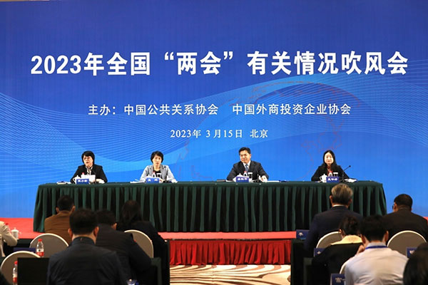 新华网北京3月16日电(记者 卢俊宇)3月15日,中国公共关系协会与中国外商投资企业协会联合举办吹风会,为在京中外企业深入解读2023全国“两会”精神。商务部党组成员、副部长盛秋平,国家发展改革委新闻发言人孟玮,商务部外资司副司长孟华婷出席并介绍情况。在华外资企业、国有和民营企业、国内外公关公司代表170多人参加会议。