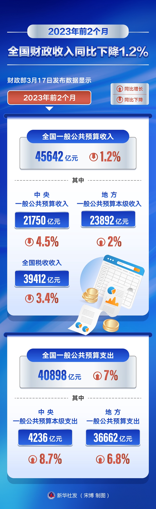 新华社北京3月17日电(记者申铖)财政部17日发布数据显示,今年前2个月,全国一般公共预算收入45642亿元,同比下降1.2%。