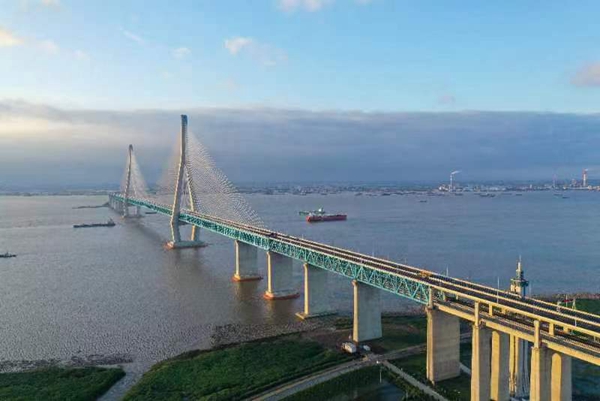 无人机航拍的沪苏通长江公铁大桥(2020年6月29日摄)。新华社记者 季春鹏 摄