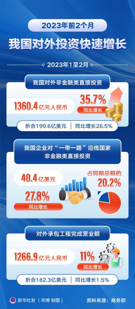 新华社北京3月28日电(记者王雨萧、谢希瑶)记者从商务部获悉,今年1至2月,我国对外投资快速增长,对外非金融类直接投资1360.4亿元人民币,同比增长35.7%(折合199.6亿美元,同比增长26.5%)。