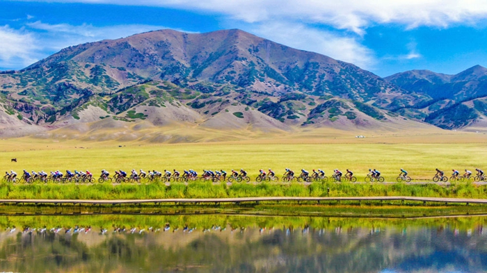 图为自行车赛选手在新疆赛里木湖国家湿地公园骑行(2022年7月26日摄,无人机照片)。近年来,新疆采取一系列措施加强湿地保护修复,初步形成以湿地自然保护区和国家湿地公园为主的湿地保护体系,湿地生态质量、生态功能得以不断提升。新华社发(于苏甫·艾尼 摄)