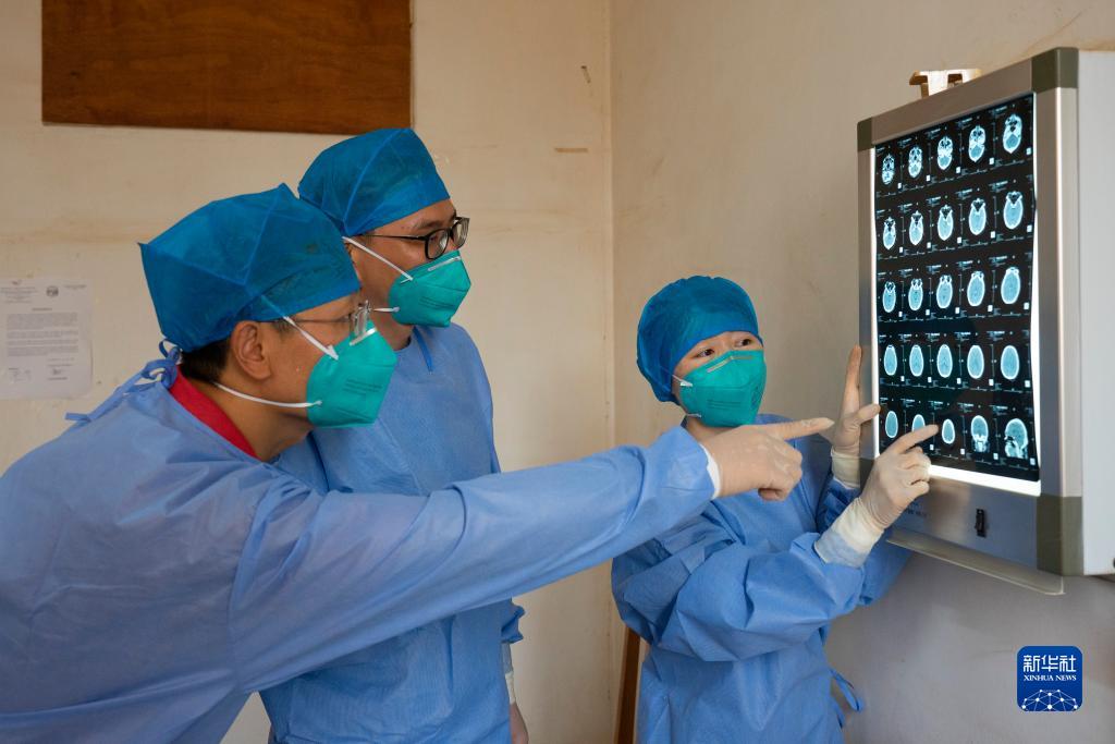 2023年2月14日,在中非共和国首都班吉友谊医院,第19批援中非中国医疗队队长、神经内科医生王宝祥(左)与外科医生徐言(中)、放射科医生王佳开展多学科会诊。新华社记者 李亚辉 摄