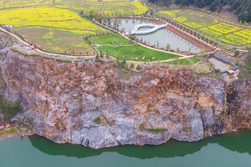 经过两年多的综合治理,2021年12月,灵山项目一期约700亩治理工程全部竣工。今年3月底,灵山“矿花苑”景区开园试运营,嶙峋崖壁边,油菜花海满目金黄,桃花、樱花开得绚烂,游客纷至沓来。除了“矿花苑”,“矿山苑”“矿水苑”“矿居苑”“矿乡苑”等正在建设,以“矿”为核心的灵山生态文化旅游区逐渐成形。