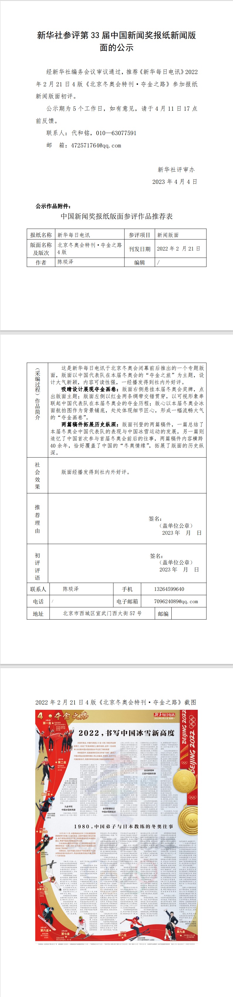 新华社参评第33届中国新闻奖报纸新闻版面的公示