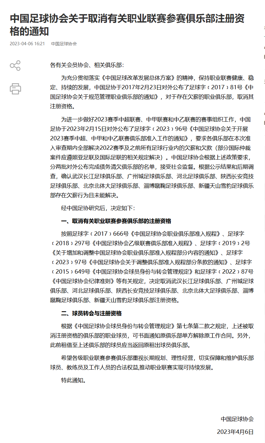 中国足协曾于2023年2月15日对外公布了《中国足球协会关于开展2023赛季中超、中甲和中乙联赛俱乐部准入工作的通知》,要求各俱乐部在本次准入审查期内全部解决2022赛季及之前所有足球行业内的欠薪和欠款(部分国际仲裁案件应遵照亚足联及国际足联的相关规定解决)。