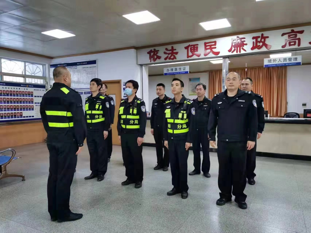 2021年3月,古暘阳(前排右一)在凤岗派出所大堂集中,参与安保工作。