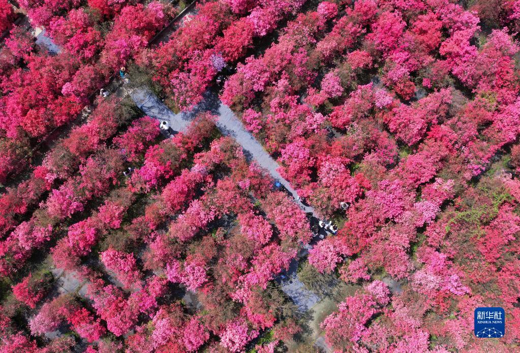 4月9日,人们在江苏无锡九龙湾花彩小镇“杜鹃花迷宫”中游玩赏花(无人机照片)。新华社发(还月亮摄)