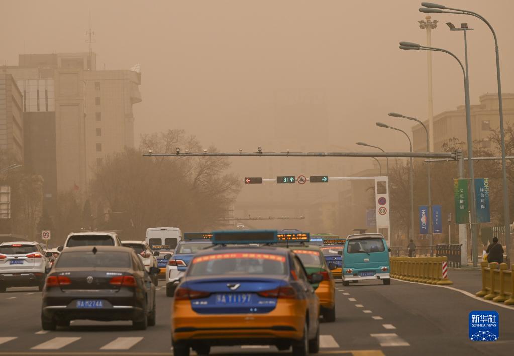 4月10日,车辆在呼和浩特街头行驶。当日,我国北方多地出现沙尘天气。新华社记者 刘磊 摄